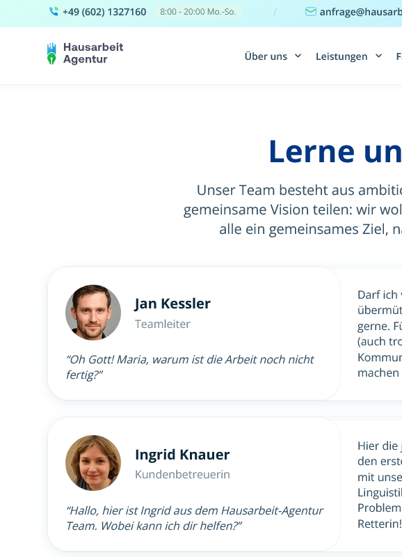 Ein Blick ins Impressum verrät, dass es sich um ein Unternehmen aus Estland handelt, das von Lauri Puskar geführt wird. Das Register verrät, dass der Betreiber in der Vergangenheit verschiedene Unternehmen unter der ID 16189904 mit verschiedenen Websites geführt hat. Die Website „hausarbeit-agentur.com“ wird dort nicht aufgeführt. So liegt die Vermutung nahe, dass die estnischen Behörden von diesem Unternehmensbereich keine Kenntnis haben. In der Rubrik „Über uns“ finden wir das „Team“, das aus acht Personen bestehen soll. Wie immer sind solche Angebereien für uns ein gefundenes Fressen. Den Teamleiter „Jan Kessler“ können wir genauso schnell wie die Kundenbetreuerin „Ingrid Knauer“ als Fake identifizieren.