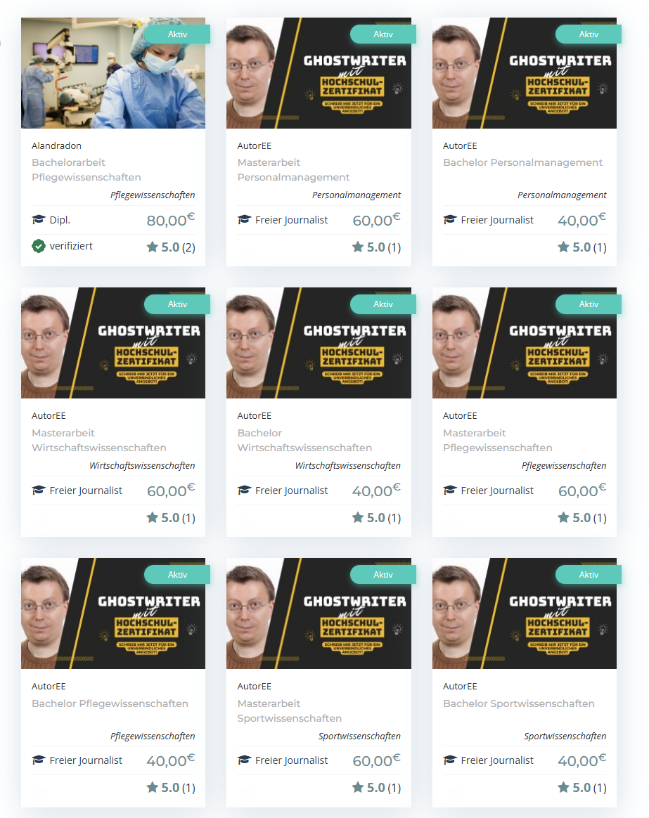 Soweit so gut. Angeblich werden die Autoren von den Betreibern Dr. Kerstin Trillhaase und Aykut Deniz Gül geprüft. Angeblich sollen man auf der Plattform über 200 Ghostwriter-Profile finden, doch die meisten tauschen mehrfach auf. Manche 12 Mal. So reduziert sich das Angebot schnell auf einen überschaubaren Wert. Wir können schnell die Nichtexistenz von folgenden Personen feststellen: • Prof. Dr. Rolf Eichhorn • Dr. Hannes Ende • Dr. phil Benedict Leuschner