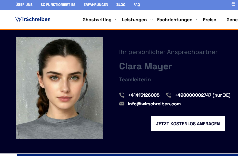 Im April 2023 hatten wir das erste Mal über WirSchreiben.com berichtet. Damals zeigten wir, dass das Bild der Kundenbetreuerin ein Fotomodell ist, dass wir zu Dutzenden im Internet finden. Das gleiche Bild ziert immer noch die Website.