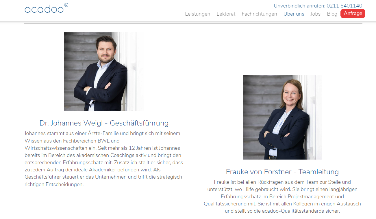 Die acadoo-Website präsentiert ein eindrucksvolles Bild seiner „Ghostwriter“.
