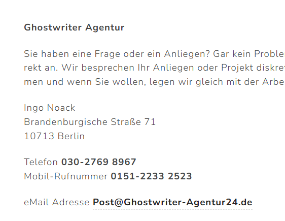 Leser unseres Blogs machen uns auf den Anbieter ghostwriter-Agentur24.de aufmerksam und erkundigen sich nach unserer Einschätzung. Und tatsächlich ist uns dieses Unternehmen bislang nicht weiter aufgefallen. Das Impressum verrät, dass die Ghostwriting-Agentur von Ingo Noack geführt wird. Sofort fällt auf, dass das Impressum auch keine Ust. ID. aufführt. Das sind die typischen Verschleierungstaktiken vieler Agenturen.