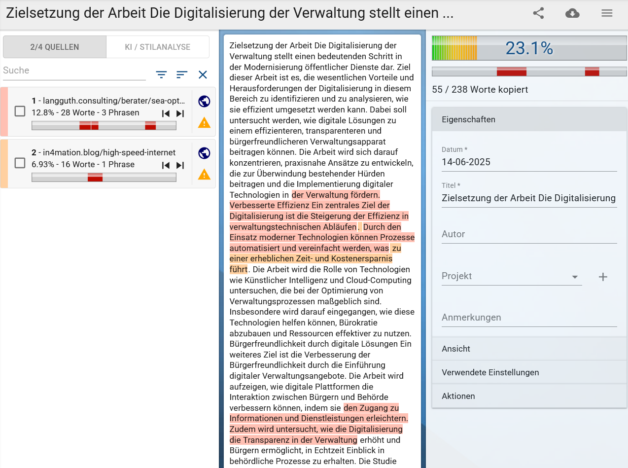 Wir haben uns mal angemeldet und den Textgenerator getestet. Der spuckt einen kurzen Text aus … die Plagiatsquote liegt bei 23,1 Prozent. Und: Die Quellen sind hundsgewöhnliche Online-Quelle. Wissenschaftliche Quelle - Pustekuchen. Wer einen solchen Text nutzt, fällt durch!