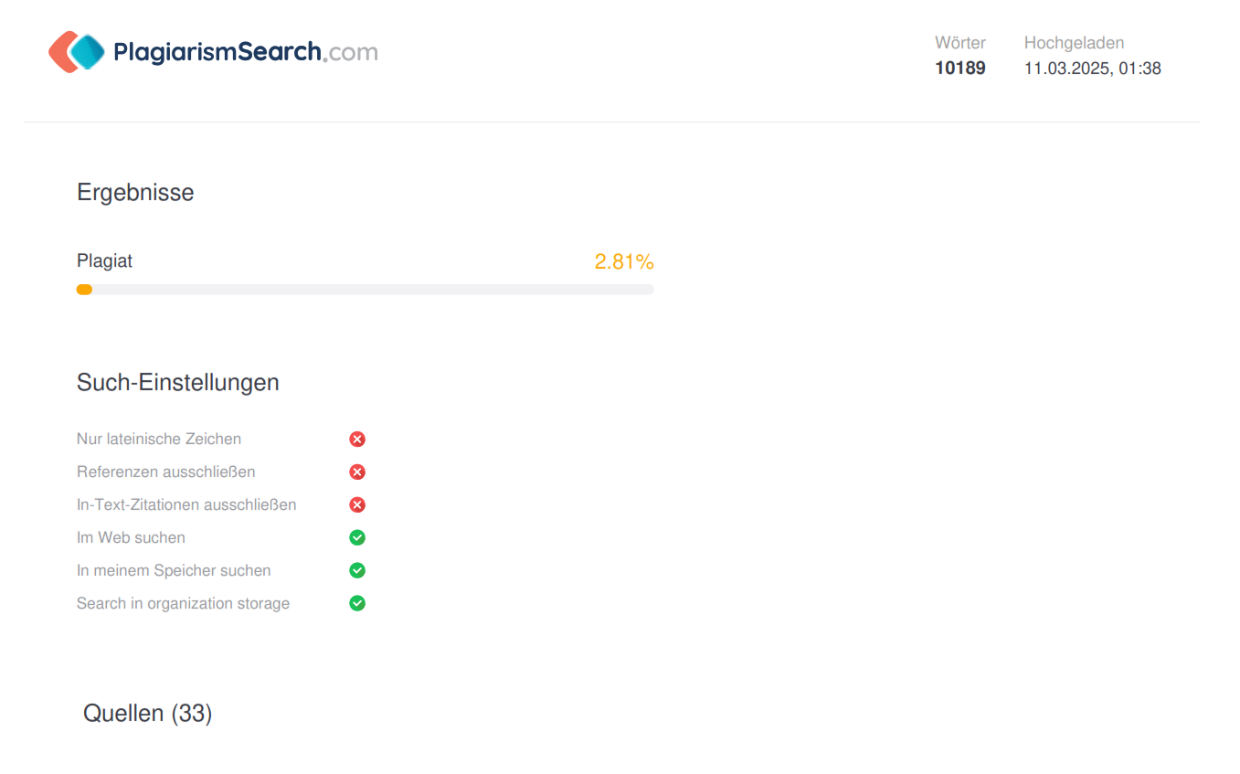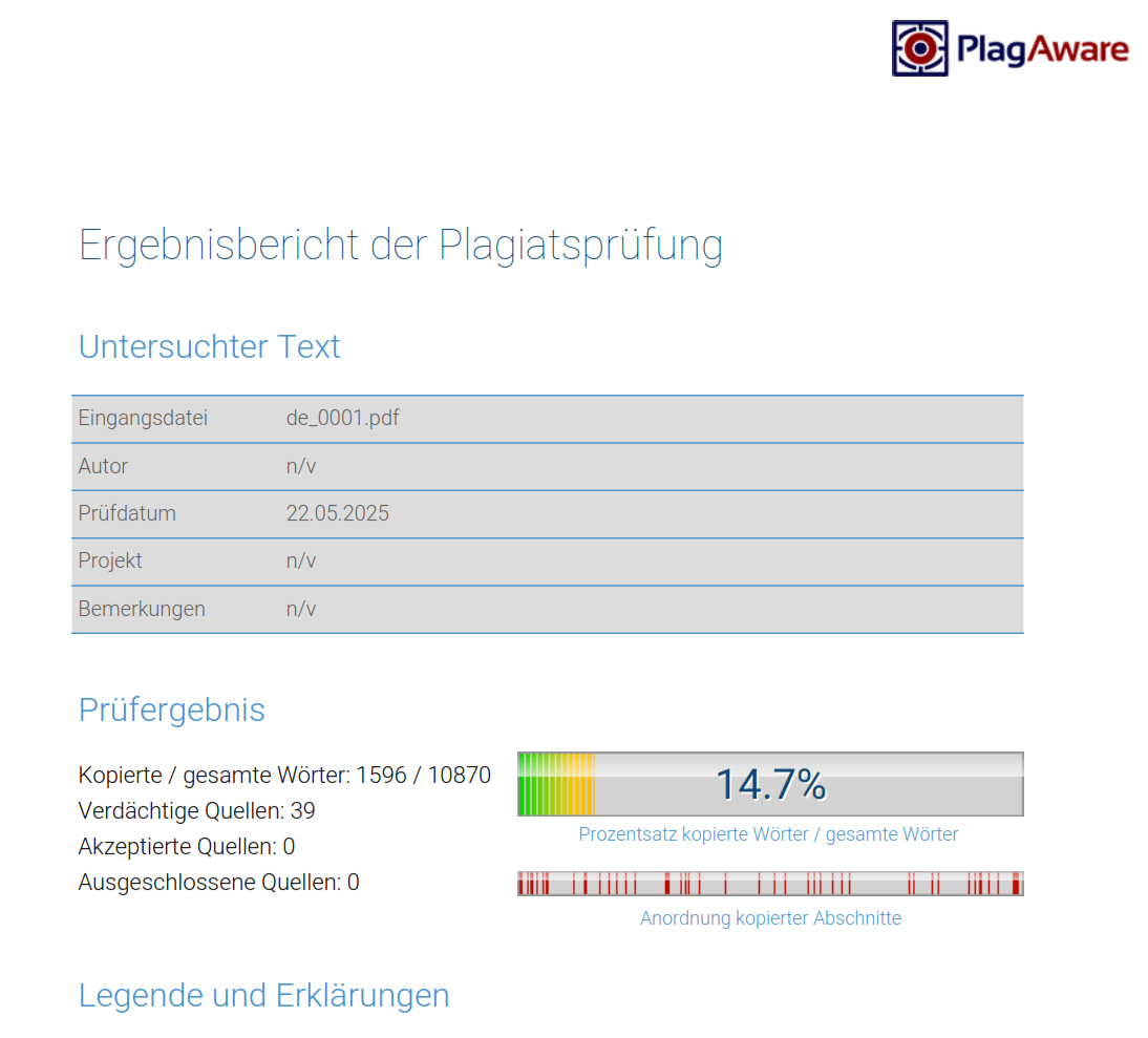 Beim ersten Überfliegen fällt zudem das schwache inhaltliche Niveau auf, das für kaum mehr als einen Schulaufsatz reicht. Hier findet man keine Methodik, keinen roter Faden, keine theoretische Fundierung! Laut der Studytexter-Website erzielt der Text mit PlagiarismSearch.com eine Plagiatquote von 2,81 Prozent. Gefunden werden 33 Stellen. Wir machen die Probe mit PlagAware auf Exempel. Das Ergebnis: 39 verdächtige Quellen und ein Ergebnis von 14,7 Prozent. Damit ist man nicht nur wegen inhaltlicher Unzulänglichkeiten, sondern auch wegen der Vielzahl an Plagiaten durchgefallen.