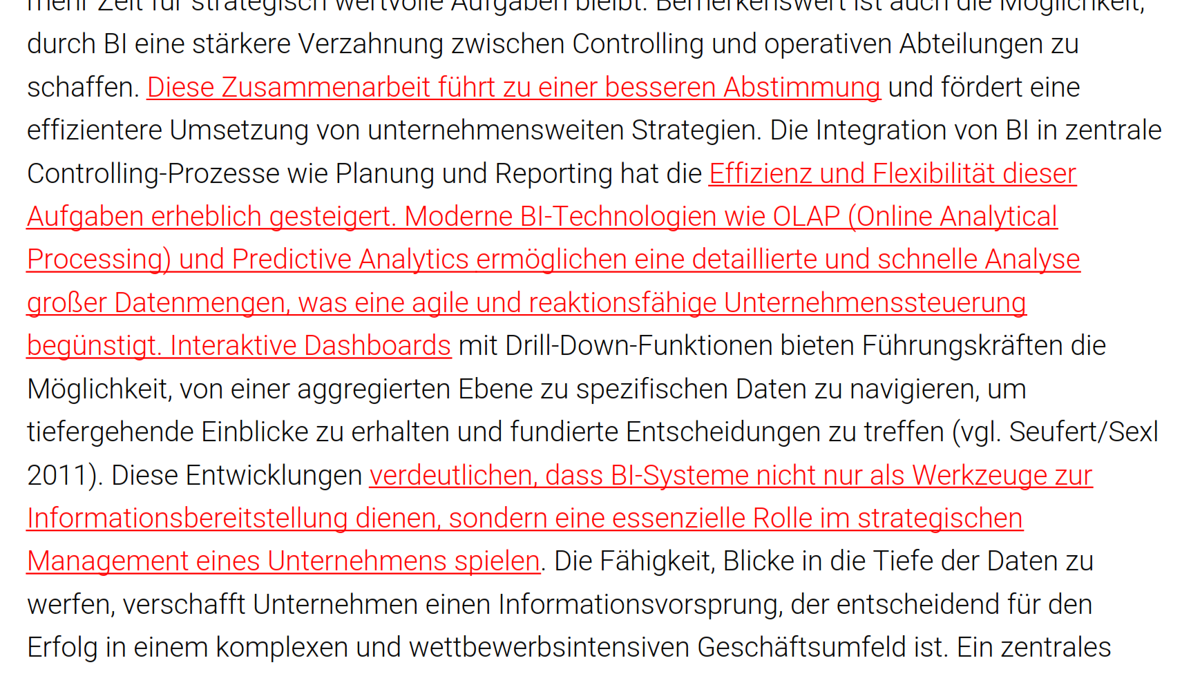Einer dieser Anbieter ist das 2024 gegründete Unternehmen Acadeo mit der Plattform Studytexter. Das Unternehmen bietet auf seiner Website einige Mustertexte, die von der Qualität zeugen sollen. Das eröffnet uns die Möglichkeit, einen Text unter die Lupe zu nehmen. Wir nehmen den Erstbesten mit dem Titel „Der Einfluss von Business Intelligence auf die Effizienzsteigerung im modernen Controlling: Methoden, Anwendungen und Zukunftsperspektiven“.